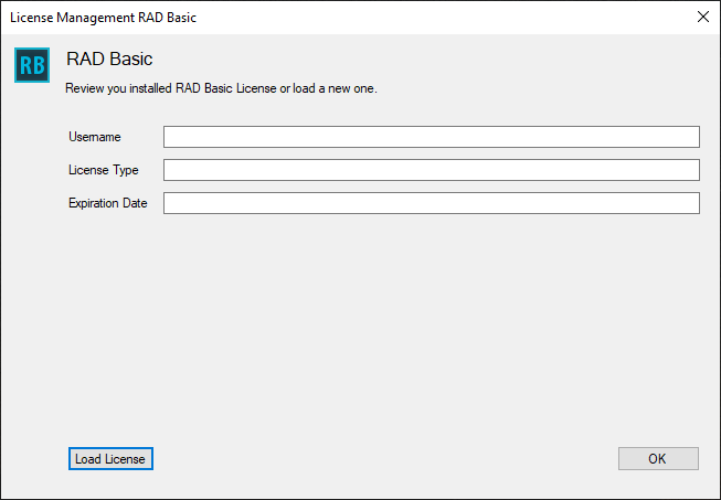 - Open RAD Basic and License Window will appear. If it is not shown, you could open it from menu: Help -> License Management