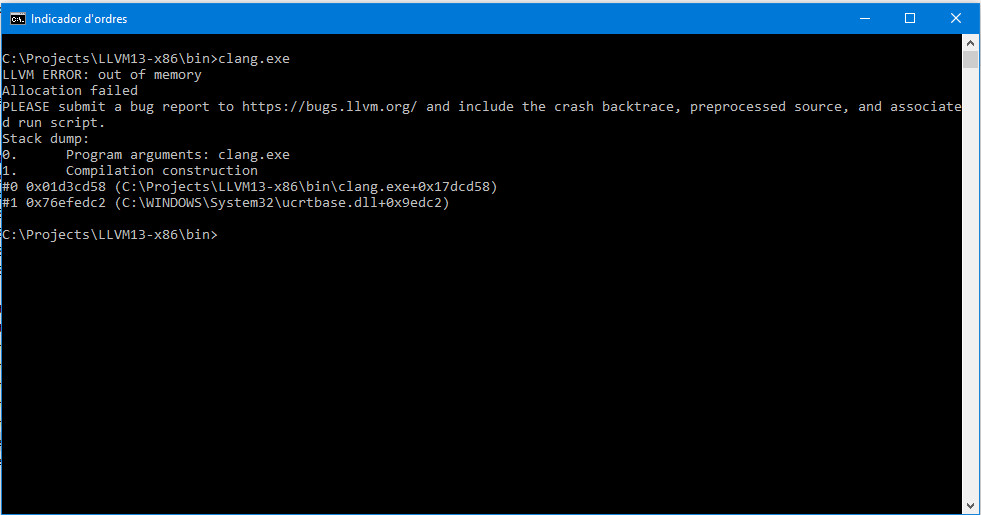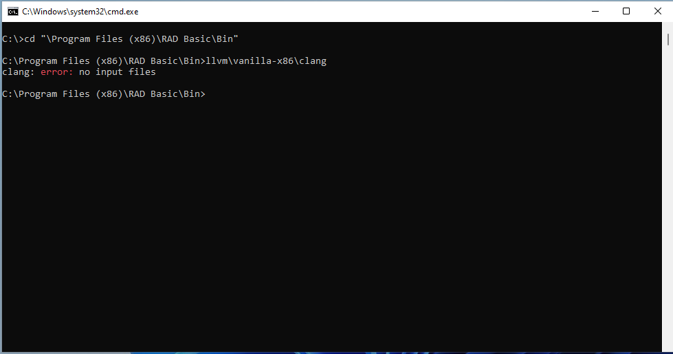 There, run clang compiler without parameters (RAD Basic includes several LLVM Clang distribution, we will see it later): llvm\vanilla-x86\clang.exe
