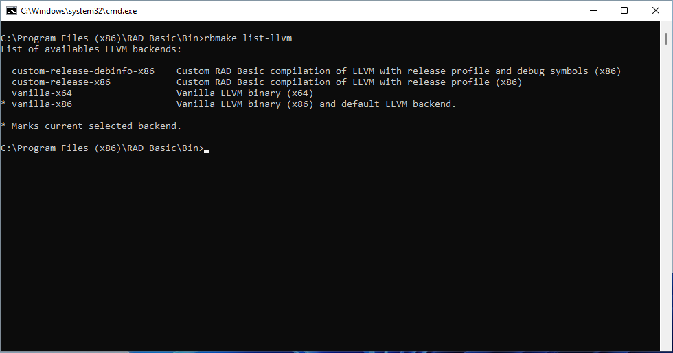 The vanilla- LLVM backends are LLVM binaries directly from LLVM distribution, meanwhile custom-release- LLVM backends are compiled and shipped by RAD Basic. The custom-release-debinfo-x86** is compiled with Visual Studio 2019 and it will likely run well in machines with issues with vanilla LLVM binaries.
